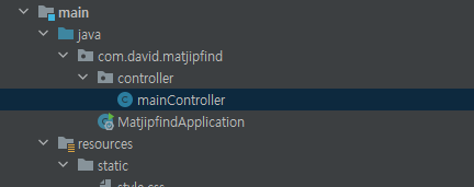먼저 main/java/com.david.matjipfind 폴더 내에 controller 패키지 생성 후 mainController 를 생성한다.