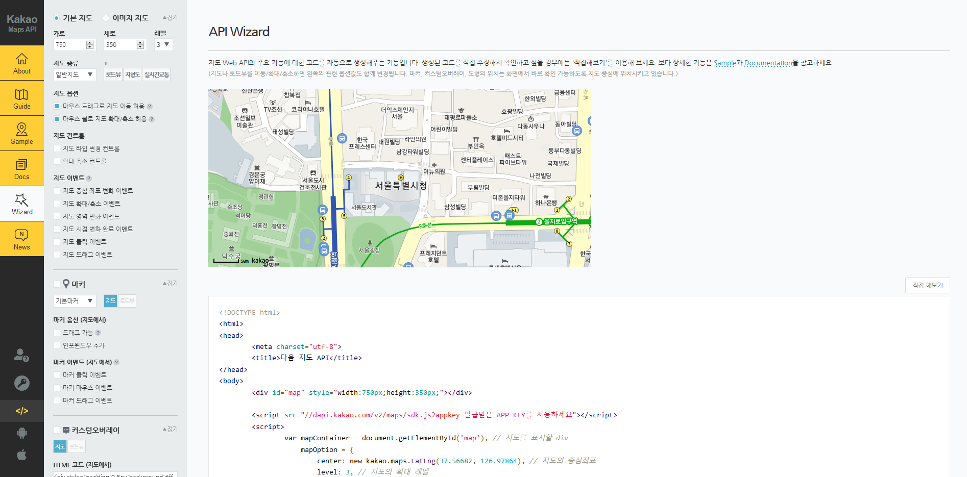 이렇게 원하는 기능을 넣은 지도를 만들 수 있는 코드가 제공된다. 이런 점에서 네이버와 비교했을 때 정말 편하고 좋은 것 같다.
