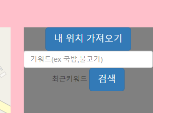 이런 식으로 키워드를 입력하는 form과 검색 버튼이 생긴다. 최근키워드라고 입력해놓은 곳은, 후에 로그인 기능을 도입하였을 때 이전에 검색한 키워드를 띄워줄 부분이다.