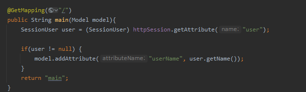 이제 thymeleaf에서 사용할 수 있도록 mainController에서 세션 객체를 만들고 user 를 받아와서 이름을 가져온다.