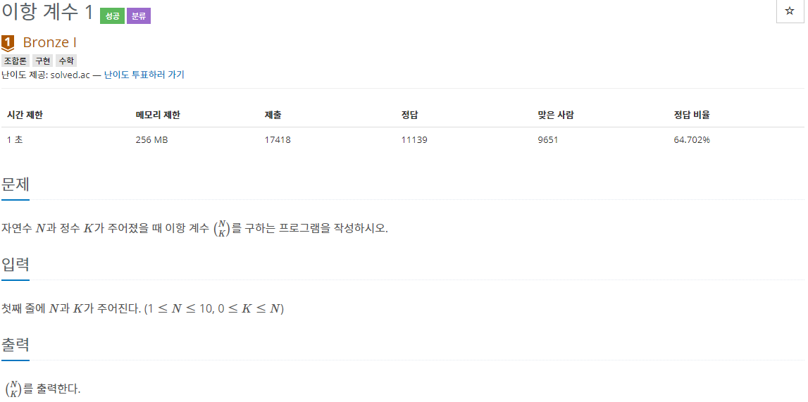 11050번 : 이항 계수 1
