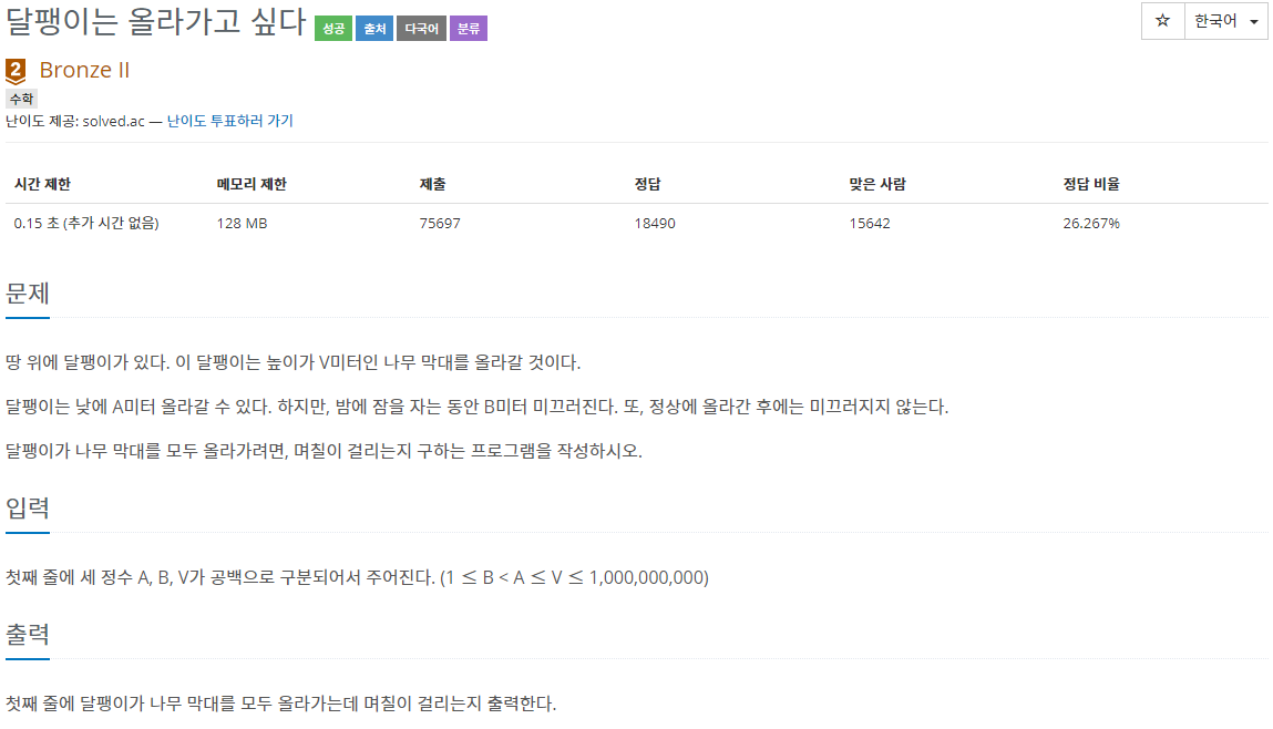 결국 v - a를 a - b 로 나눈 몫 (나머지가 있다면 올림)은 도착하기 하루 전날이 될 것이고, 그 다음날 낮에 도착점을 찍게 된다.