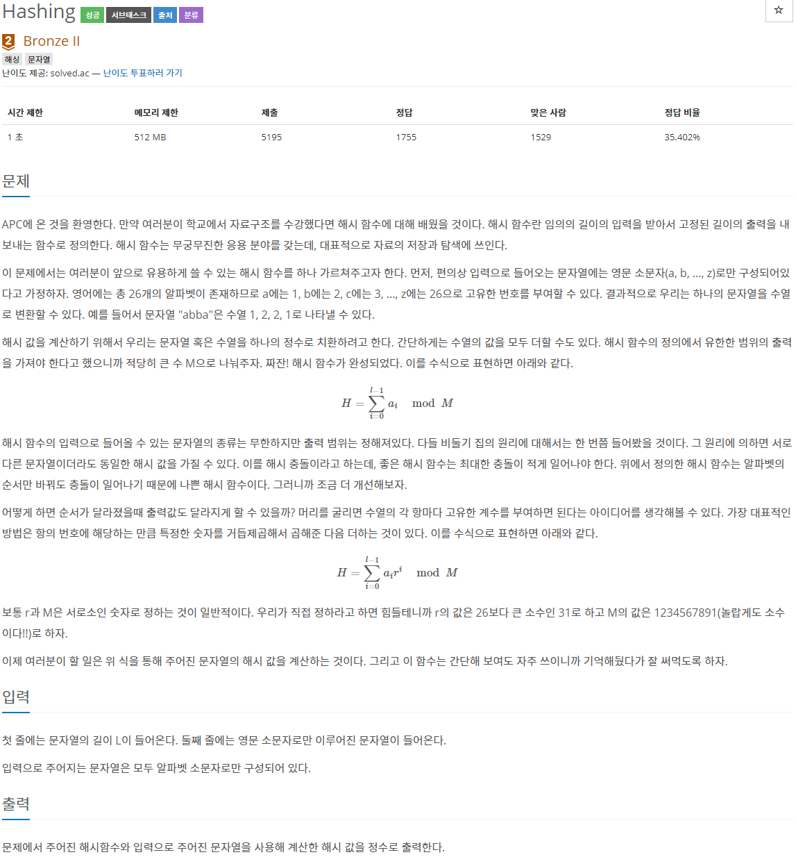 문제는 간단히 문자열을 수열로 바꿔서 특정 규칙을 이용해 더한 후 모듈러 연산(나머지 연산) 을 통해 해시 함수를 구현하라는 것이다. 설명은 길고 수식도 막 나오는데 별로 어렵지 않다.