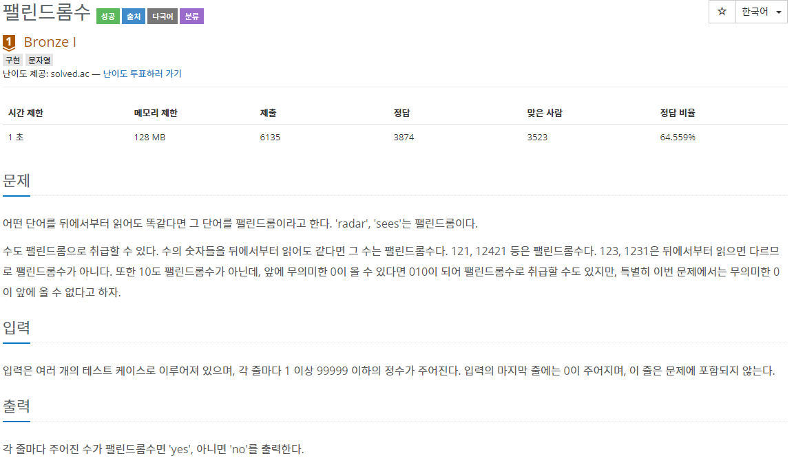 1259번 : 펠린드롬수