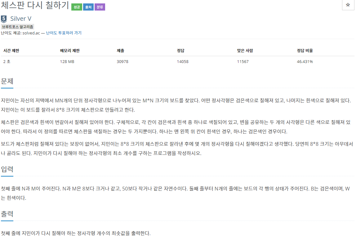 잘 생각해 보면 어떤 line에서 1번 케이스를 만족하기 위해 바꿔야 하는 횟수가 X 라면, 2번 케이스를 만족하기 위해 바꿔야 하는 횟수는 8 - X 이다. line은 총 8개 존재하므로 64에서 바꿔야 하는 횟수를 빼 주면, 그것이 바로 다른 케이스에서 바꿔야 하는 횟수이다.