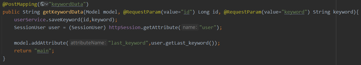 컨트롤러에서는 해당 Service의 메서드를 호출해 준다. Ajax를 통해 받은 id 와 keyword를 매개변수로 호출하면 된다. 이후 세션에서 last_keyword를 받아와서 뷰로 넘겨준다.