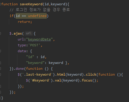 map.js에서는 saveKeyword 함수를 정의하여 사용한다. saveKeyword에서는 먼저 로그인이 되어 있지 않을 경우(id==undefined) 그냥 함수를 종료한다. 로그인 되어 있을 경우 Ajax를 이용해 id와 keyword를 객체에 담아서 data로 keywordData에 POST 방식으로 전송한다. 이후 전송이 완료되었다면 '최근키워드' 라고 적혀 있던 란을 keyword로 교체하고, 해당 keyword 를 클릭시, focus가 검색창으로 이동되면서 자동으로 keyword가 입력된다.