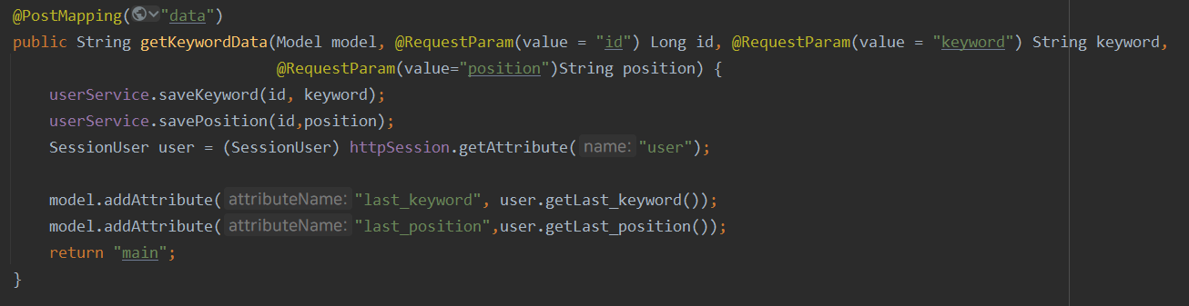 컨트롤러에서는 키워드 저장을 위한 savePosition함수를 호출해준다. 매개변수는 id와 position이다.