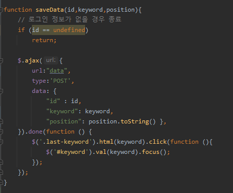 먼저 유저 키워드 기능을 구현하기 위해 saveKeyword 함수를 saveData 로 변경하고 위치 정보도 함께 가져왔다.