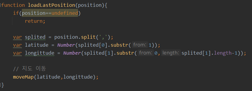 이를 가져와서 실제로 지도에 넣기 위한 코드이다. 일단 그냥 가져오게 되면 "(위도, 경도)" 의 형태인 문자열이기 때문에, split을 통해 위도와 경도를 분리해주고, 위도는 두번째 글자부터(괄호 제외), 경도는 첫번째 글자부터 마지막에서 두번째 글자를 substr을 이용해서 떼어낸 뒤 Number로 형변환한다.