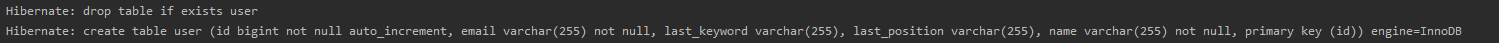Hibernate: create table user (id bigint not null auto_increment, email varchar(255) not null, last_keyword varchar(255), last_position varchar(255), name varchar(255) not null, primary key (id)) engine=InnoDB