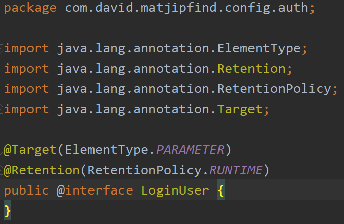 LoginUser 어노테이션을 생성해주고, ElementType을 PARAMETER로 설정해준다.