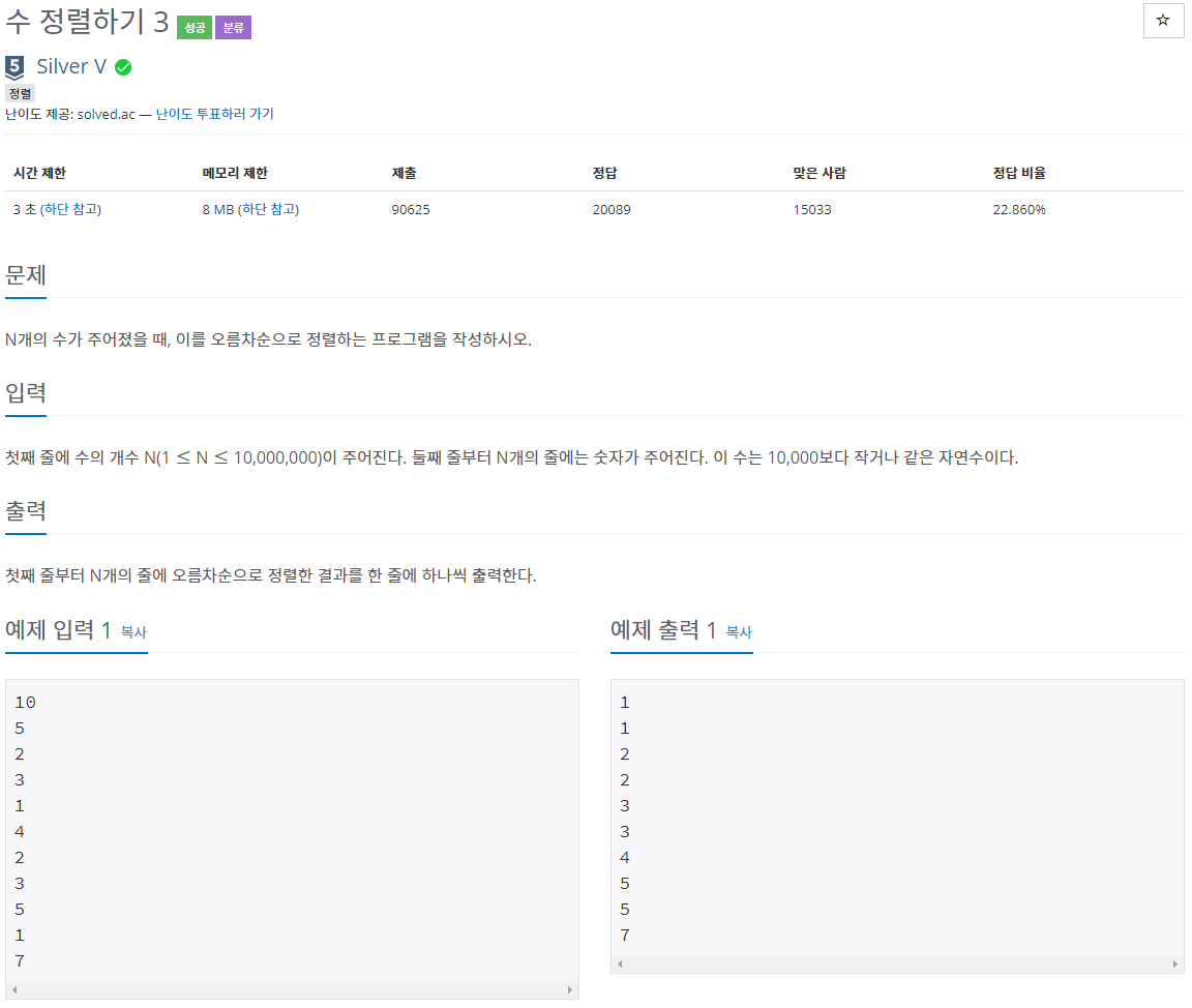 이 수 정렬하기 문제는 이전 문제와 달리 최댓값이 10000이고 대신 최대 1천만 개의 입력이 들어올 수 있다. 들어올 수 있는 데이터는 더 많아졌더라도 value가 최대 1만이라는 비교적 적은 수이기 때문에 계수 정렬을 사용한다면 좋을 것이다.