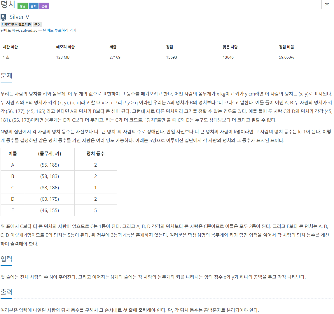 몸무게와 키가 모두 큰 사람이 있는 만큼 순위가 밀린다. 즉 A부터 한 사람씩 다른 모든 사람과 비교하면서 자신보다 몸무게와 키가 둘 다 큰 사람이 있다면 순위를 +1 해주면 된다.