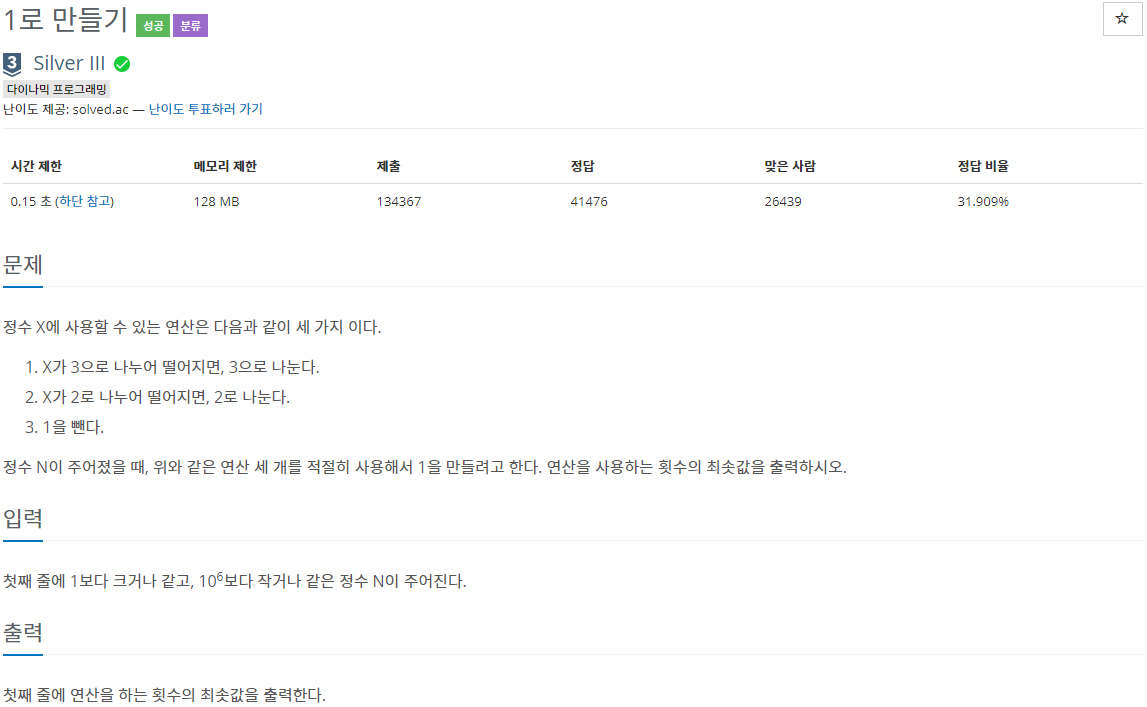집합을 이용한다면 시간 초과에 걸리지 않고 통과할 수 있다. 먼저 count 변수에 0을 대입하고, 집합에 1을 뺀 값, 2로 나눈 값, 3으로 나눈 값을 넣은 뒤 기존에 있던 원소들을 제거한다. 이 과정을 한 번 반복할 때마다 count 변수에 1을 더하고, 집합에 1이 있다면 바로 count를 출력하고 종료하는 방법이다. 리스트에 저장해도 되지만 중복되는 수들로 인해 시간이 훨씬 오래 걸려서 set을 사용했다.