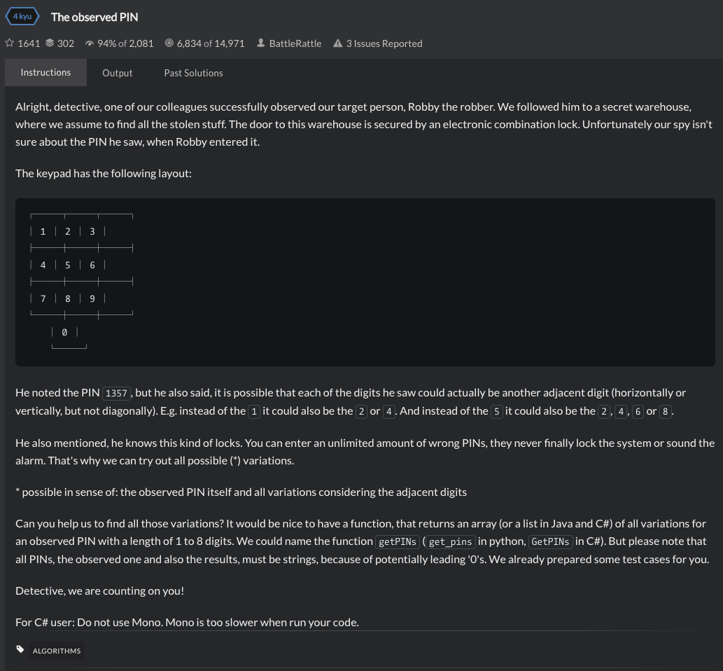 문제는 간단하다. 비밀번호로 추정되는 숫자가 들어오는데, 확실하지 않아서 해당 수에서 인접한(상하좌우, 대각선 제외) 숫자까지 모두 눌러봐야 하는 상황에서 가능한 모든 비밀번호를 return하면 된다. 나는 이렇게 힘들게 작성했다.