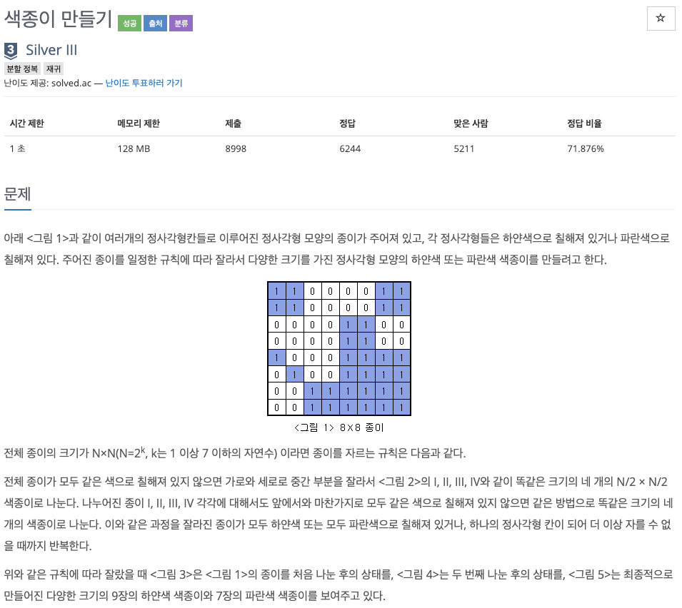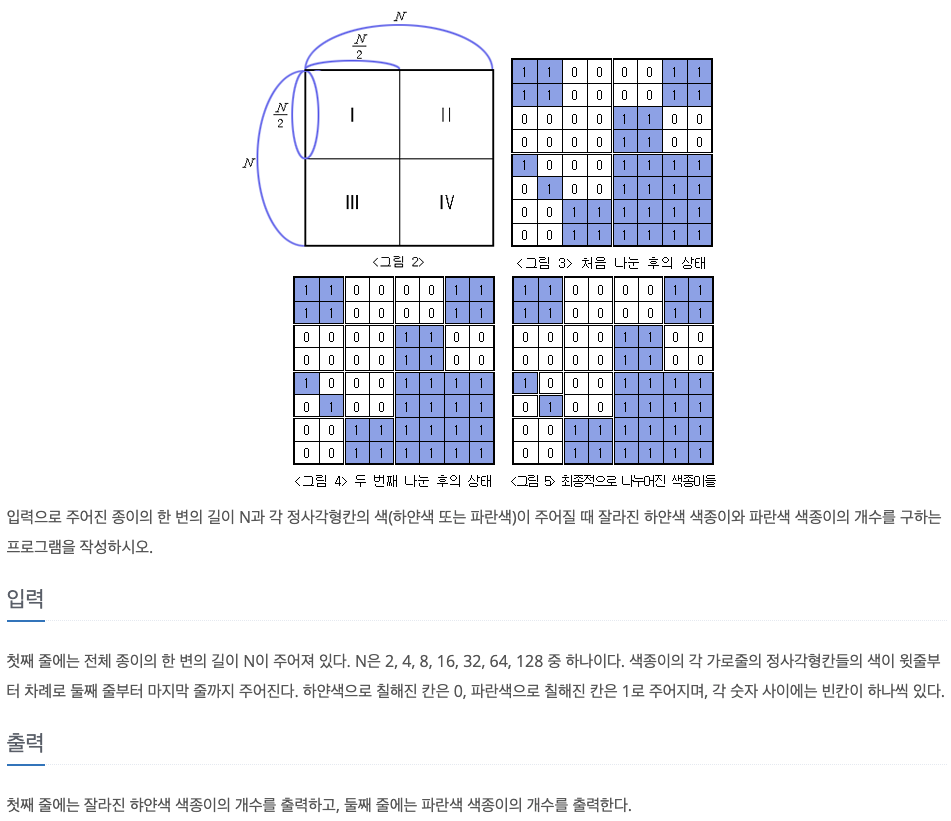 기초적인 분할 정복 문제라고 할 수 있겠다. 큰 사각형부터 시작해서 조건이 맞지 않는다면 작은 사각형 4개로 나누는 과정을 반복하여 해결할 수 있다. 재귀함수로 구현할 수 있다.