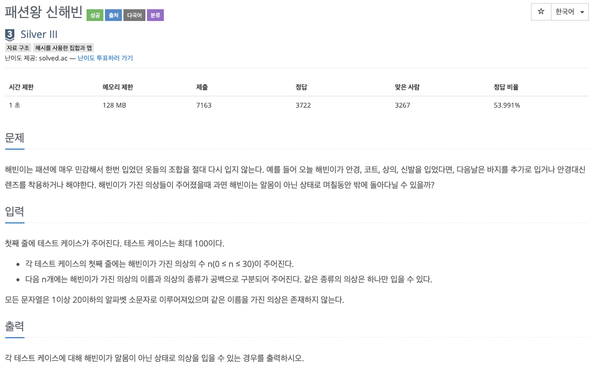 해당 분류를 입지 않는 경우를 생각해서 1을 넣어주는것만 잊지 않았다면 쉽게 풀 수 있다. 그리고 마지막에 모든 의류를 입지 않아 알몸인 경우 1만 빼고 출력해준다.