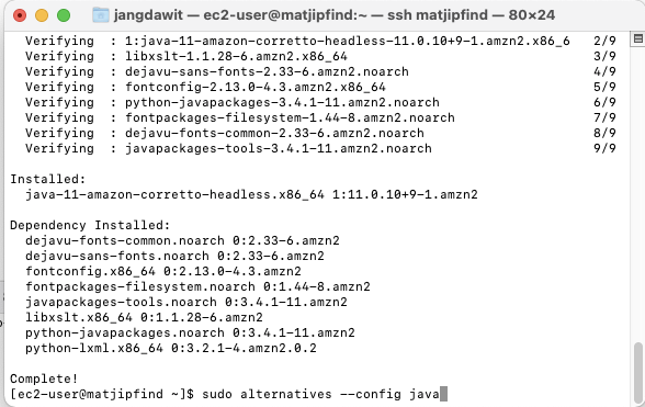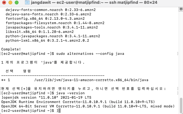 명령어를 통해 자바 11을 설치하고, 잘 설치되었는지도 확인.