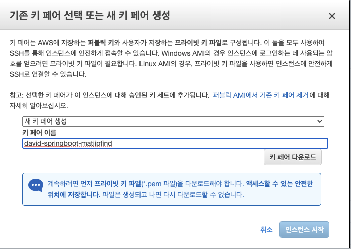펌키도 만들어 다운로드 해주고 인스턴스를 시작한다.