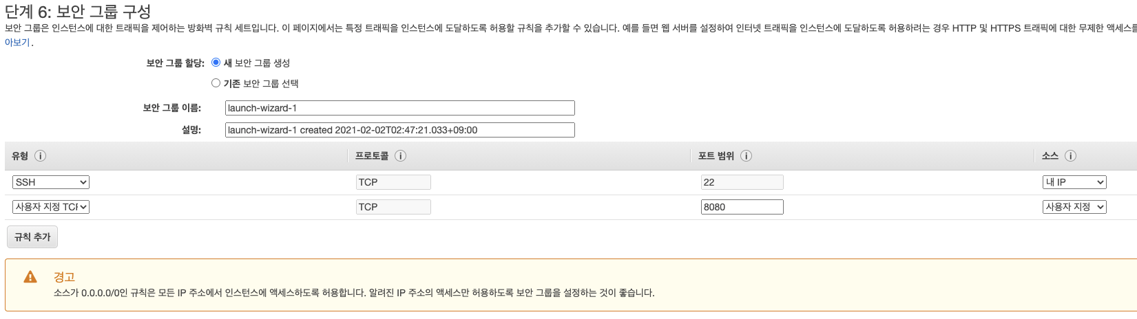 보안 그룹은 콘솔에서 접속하기 위해 22와 기본 포트 8080을 열어둔다.