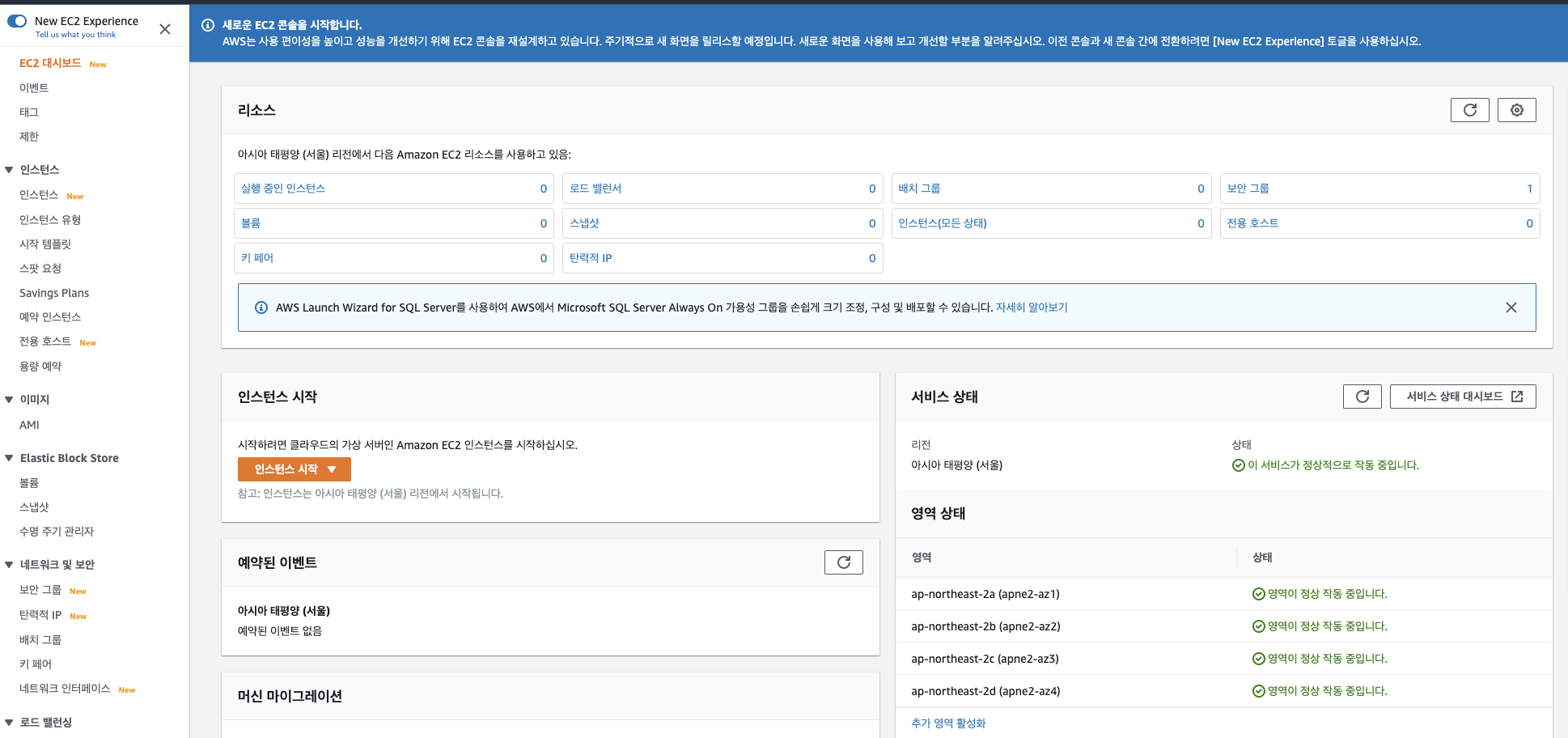 기다리고 EC2 콘솔에 들어가보면 이런 대시보드가 보인다. 여기서 인스턴스 시작을 통해 인스턴스를 생성해준다.