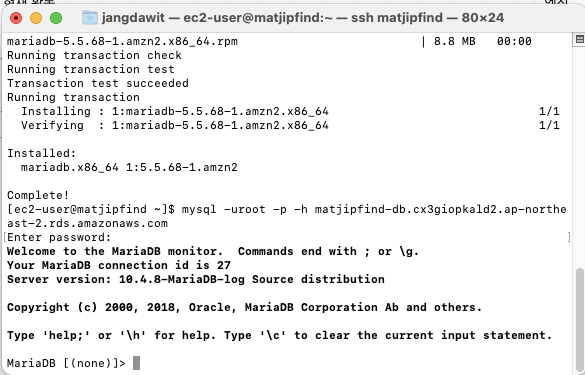 이제 EC2에서도 RDS에 접근이 되는지 확인하기 위해 SSH접속 후 mysql설치