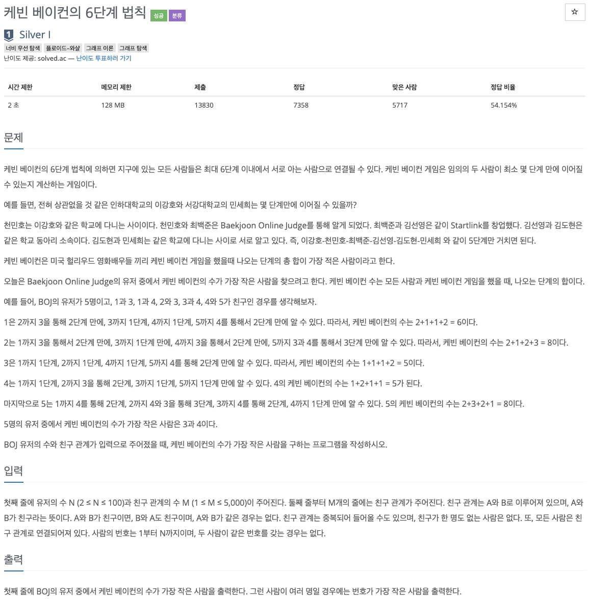 모든 사람에 대해 너비 우선 탐색을 진행하면 된다. 그러면 다른 모든 사람에 대한 케빈 베이컨 수가 나오고, 이를 합한 값이 가장 작은 사람의 번호를 출력하면 된다.