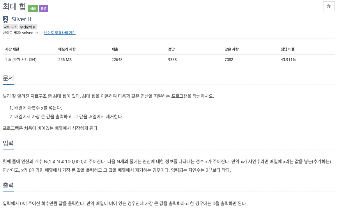최대 힙을 구현하는 문제이다. 자료구조를 잘 이해하고 있다면 직접 구현할 수 있다.